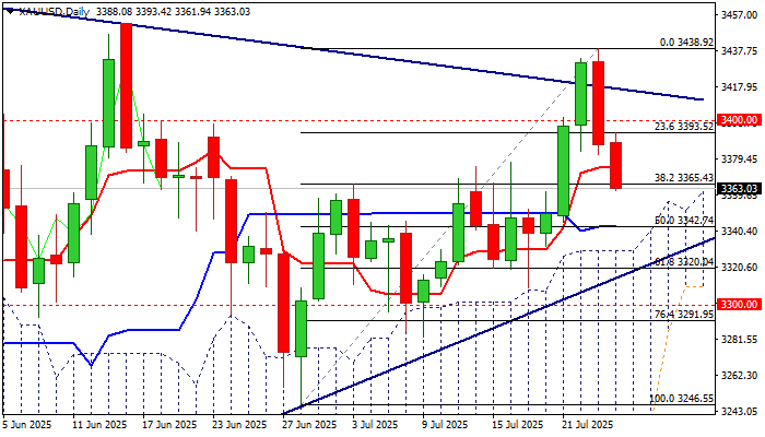 The yellow metal’s price lost around 2% since Wednesday’s opening and cracked pivotal support at $3365 (Fibo 38.2% of $3246/$3438, reinforced by 10DMA, with sustained break here to confirm reversal signal, following Wednesday’s completion of bearish engulfing and close below psychological $3400 support.