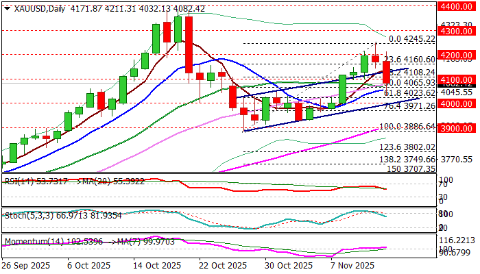 Near-term focus shifted lower after pullback from Thursday’s recovery peak ($4245) retraced nearly 61.8% of $3886/$4245 upleg, on dip to the session low at $4032 (that also exposed $4000 support (psychological / bull-channel lower boundary