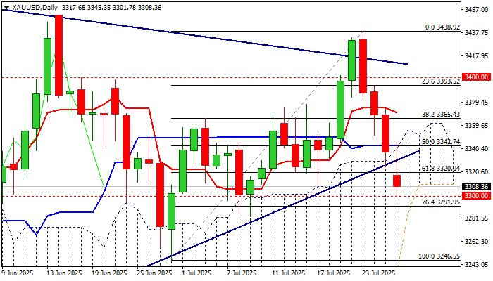 The metal’s price fell to the lowest in three weeks after US-EU trade agreement further lifted dollar, pushing gold through key supports at $3340 (daily cloud top) and $3330 (triangle support line), with fresh acceleration hitting levels just ticks ahead of psychological $3300 support.