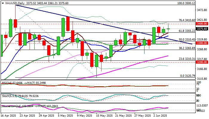 Probe through significant barriers at $3400 zone (former recovery top / psychological / Fibo 76.4% of $3500/$3120 correction) is about to generate fresh bullish signal, which requires close above these barriers to be confirmed.