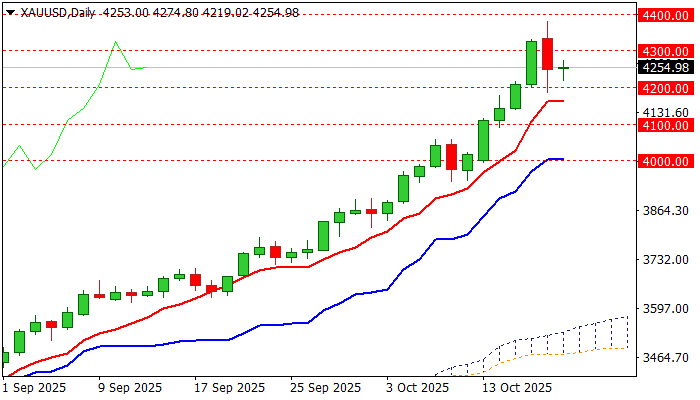 Gold holds within a narrow consolidation on Monday following almost 2% pullback from new record high ($4380) on Friday, driven by surprise comments from President Trump that the latest tariffs on China’s imports won’t be sustainable.