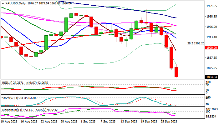 Two strong bearish signals were generated on loss of psychological $1900 support and $1884 (low of Aug 17), which added to scenario of bearish continuation, as the metal is in downtrend from $2080 (record high, posted on May 4).