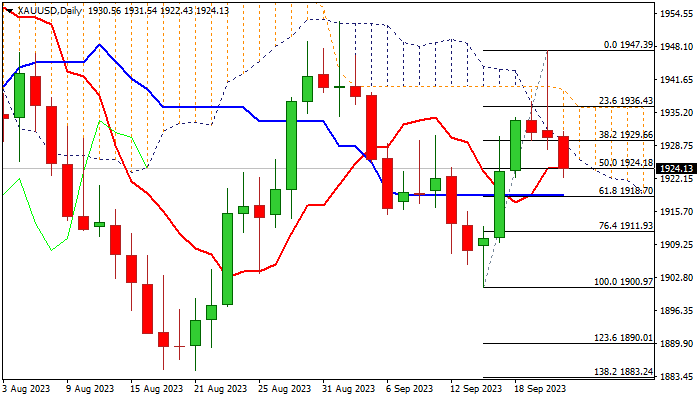 Close below 50% retracement ($1924, reinforced by 200DMA) is needed to confirm signal and risk deeper drop towards Fibo targets at $1918/11 (Fibo 61.8% / 76.4% respectively) and expose key near-term support at $1900 (Sep 14 higher low).