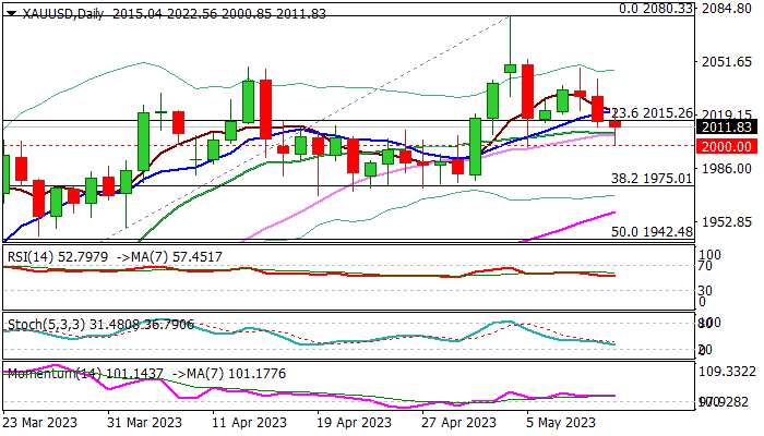 The second strong rejection at $2000 points to strength of the support and also signals that the metal’s price remains underpinned by the turmoil over US debt ceiling and persisting fears that crisis in the US banking sector may deepen, following fresh negative news..