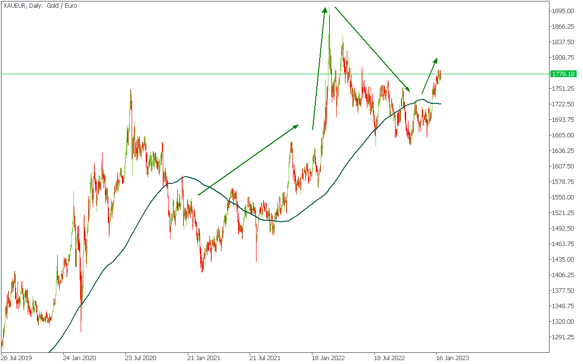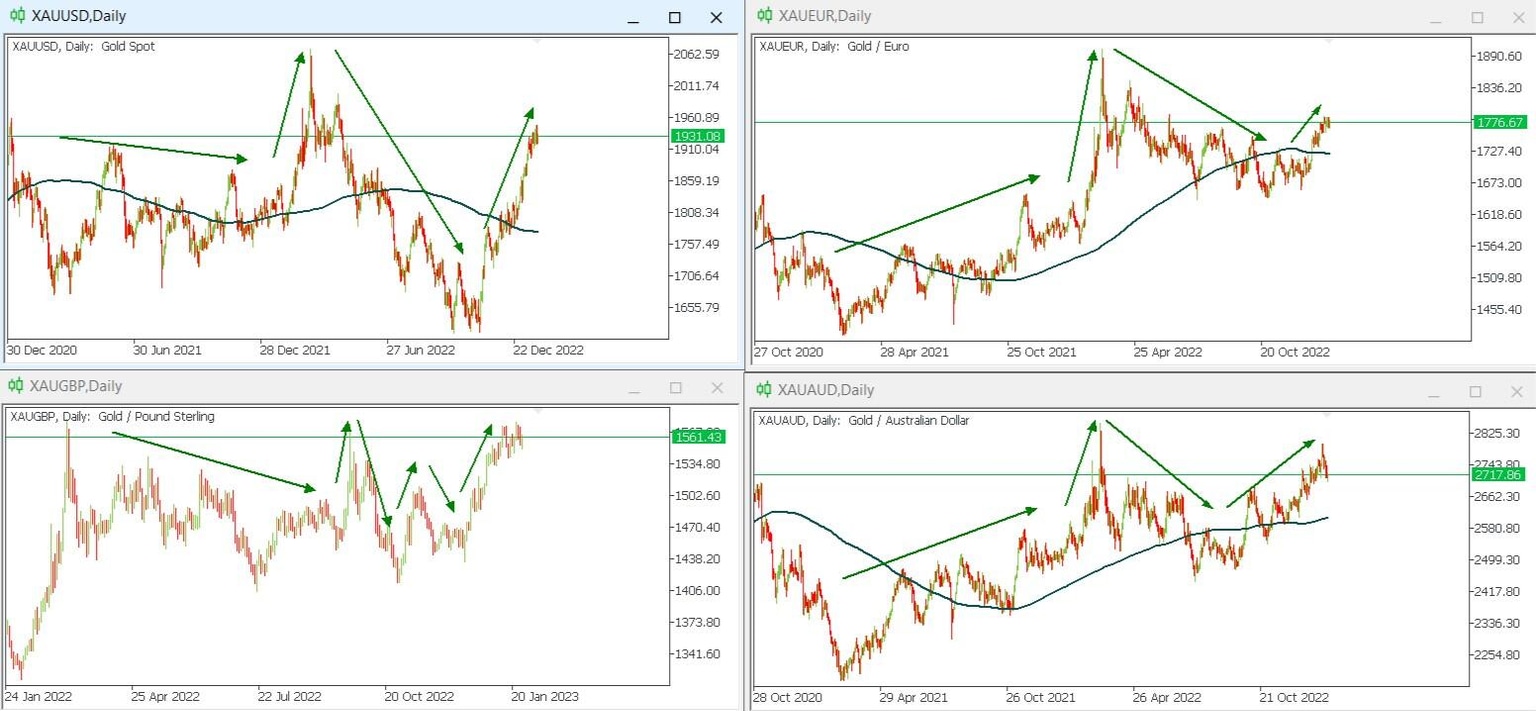 While XAU/USD was moving down from March to October 2022, XAU/GBP stayed in a sideways movement and now is almost at an all-time high. Somewhat similar happened to XAU/AUD, which is only 4.97% below the ATH (all-time high). On the other hand, XAU/EUR didn’t have a rally in the last months of 2022 due to the EUR strength. Let’s dive deeper into the fundamentals behind these movements and provide some technical analysis.