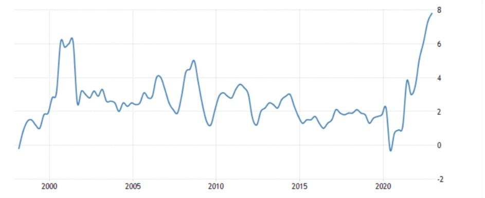 The EU experienced rising prices, too. Moreover, the ECB started rate hiking way after the Bank of England and the Federal Reserve, causing the EUR to fall for ten consecutive months.