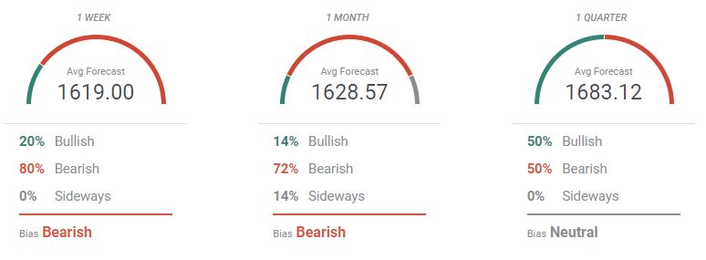 The FXStreet Forecast Poll shows that market players are waiting for XAU/USD to remain under pressure in the weeks to come. For the weekly perspective, 80% of the polled experts are betting for levels below the current one, with an average target of $1,619 a troy ounce. Bears stand at 72% in the monthly perspective while decreasing to 50% in the quarterly view.