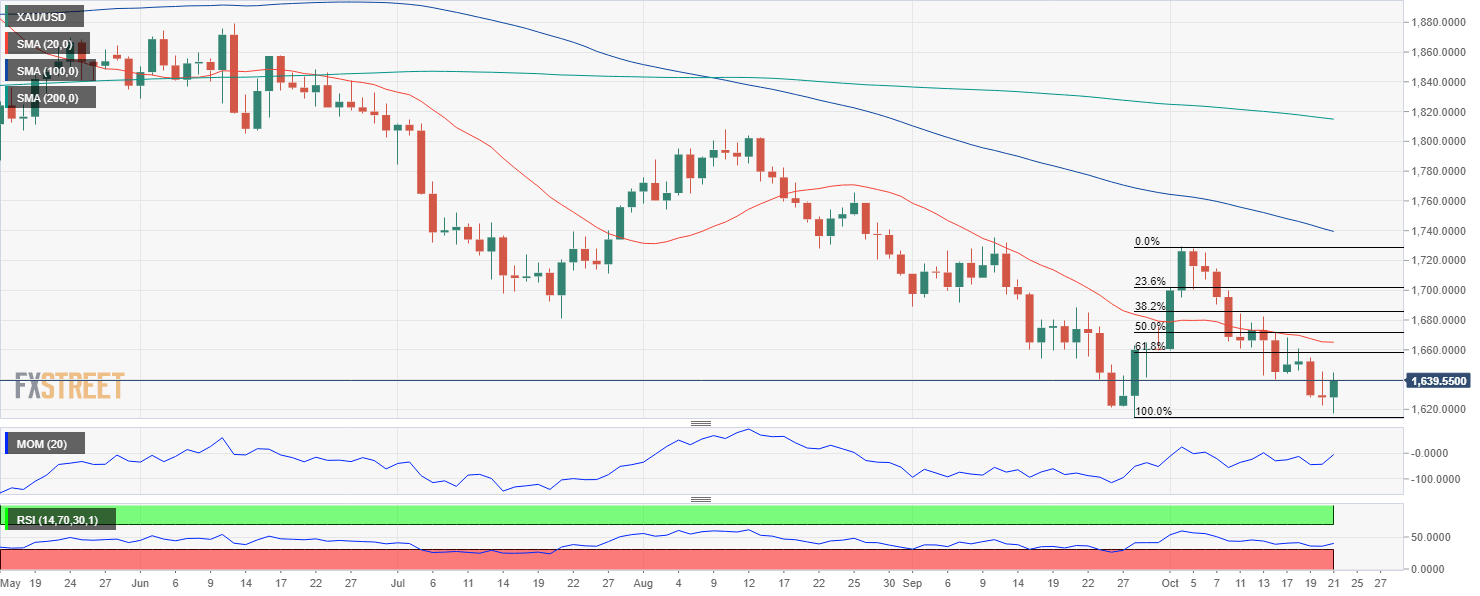 XAU/USD weekly chart shows that the risk remains skewed to the downside. The bright metal spent the last few days below a critical Fibonacci resistance level at $1,658.50, the 61.8% retracement of the $1,614.81/$1,729.54 rally. At the same time, the metal keeps developing far below all of its moving averages, with the 20 SMA heading firmly south far above the current level. Technical indicators, in the meantime, remain within negative levels, with the RSI stable near oversold readings and the Momentum grinding north below its midline.