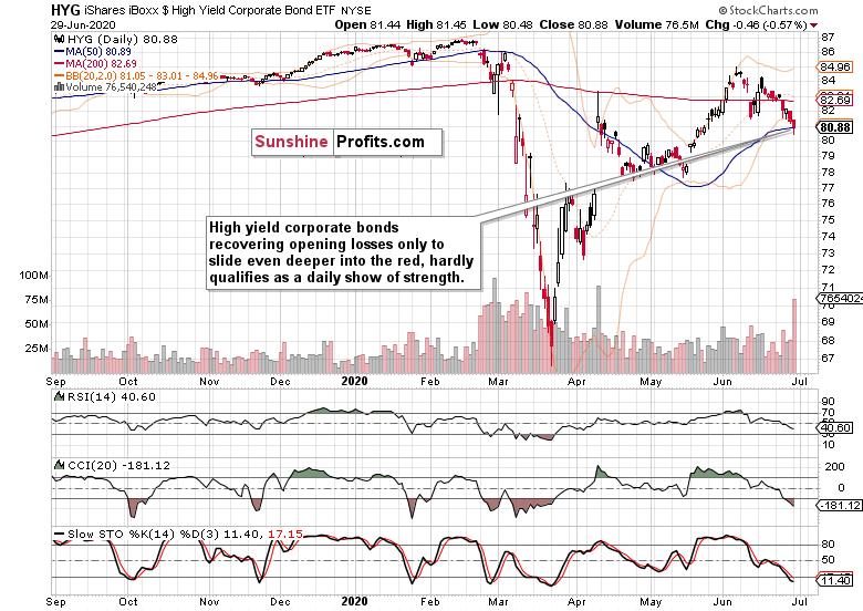 Both of these points remain valid also today. Stock bulls haven't made any progress as the S&P 500 futures keep trading at around yesterday's closing prices, and junk corporate bonds during the remainder of the regular session dived again while stocks mostly rallied.