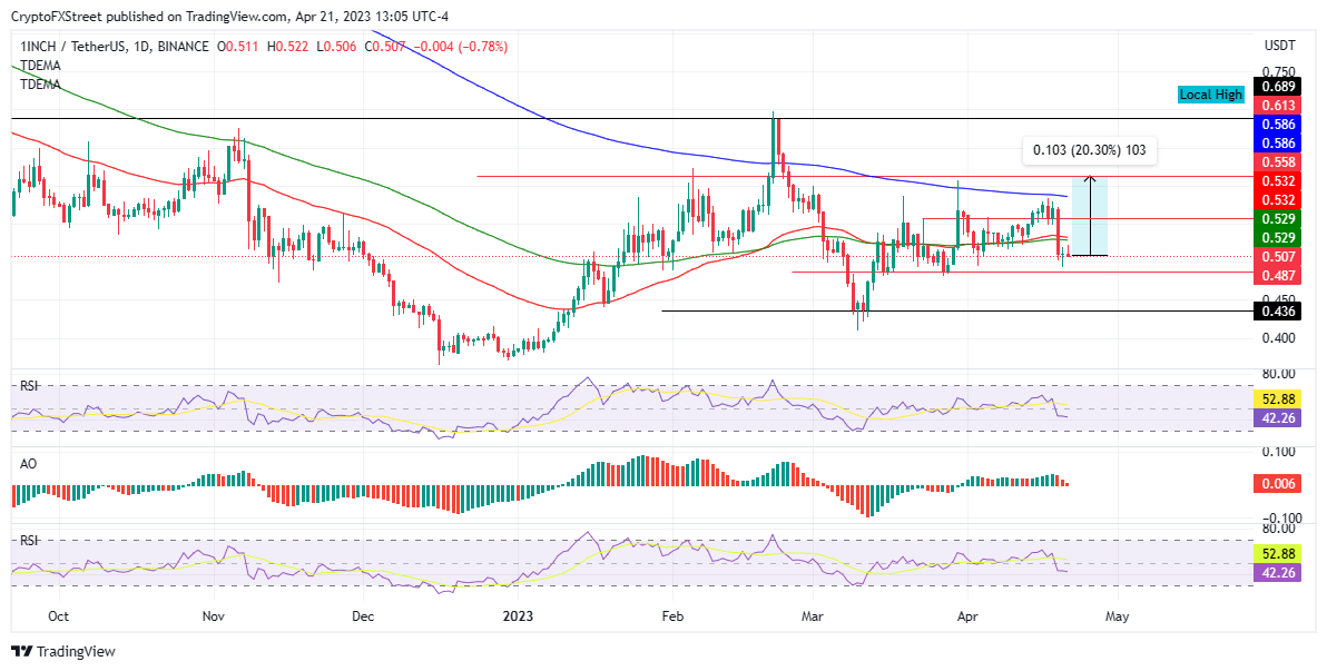 1inch price (1INCH) failed to display any directional bias since mid-March, consolidating under the 200-day Exponential Moving Average (EMA) as this price-tracking indicator stunted the growth potential of the altcoin. A bullish effort to escape from the bearish grip was present but not sufficient compared to the fight put by the bears, which explains the red candlestick on April 19 in the one-day chart below).