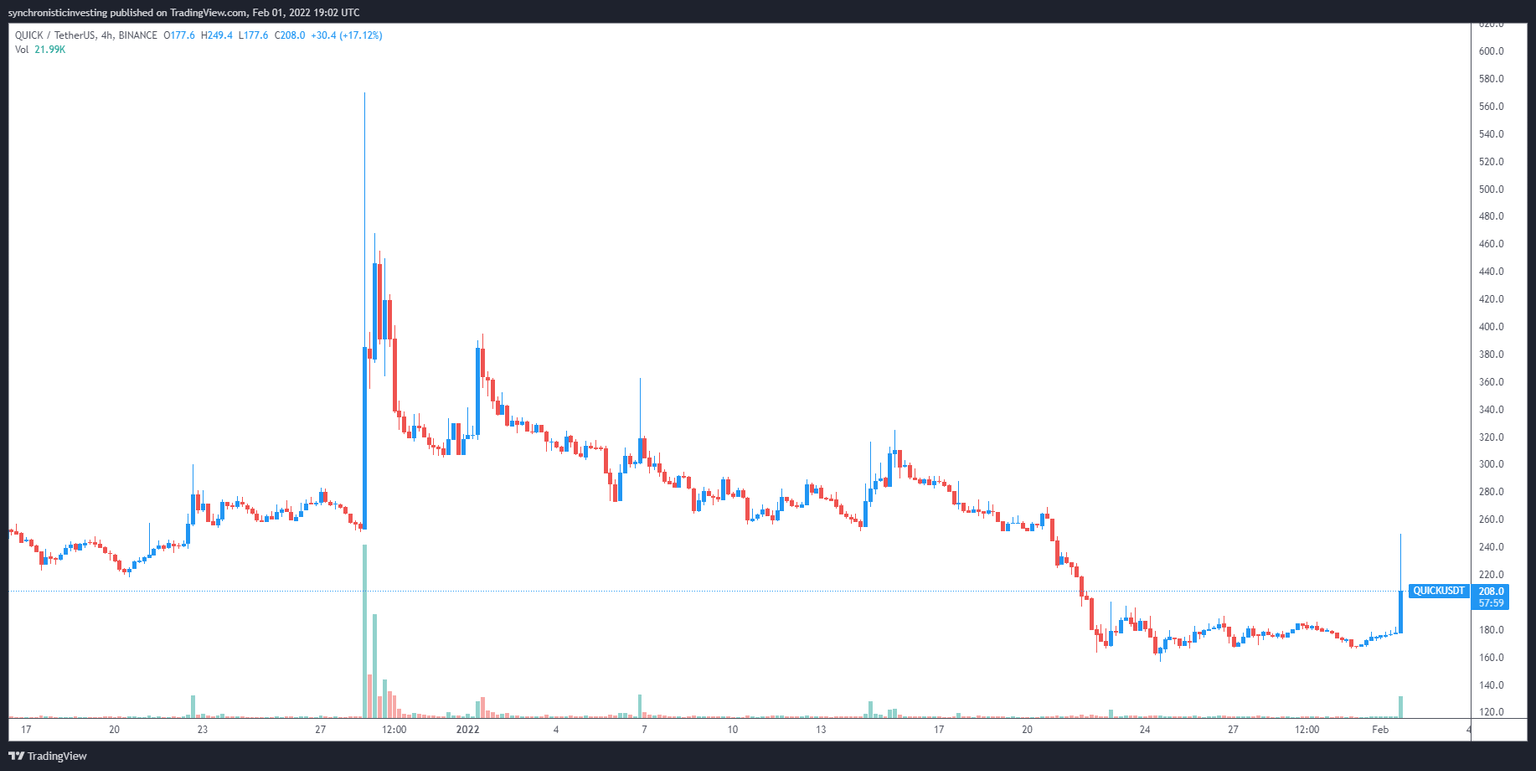 Data from Cointelegraph Markets Pro and TradingView shows that the price of QUICK saw a rapid 50% spike in value from $166.40 on Jan. 31 to a daily high of $250 on Feb. 1 after its 24-hour trading volume surged by 168%.