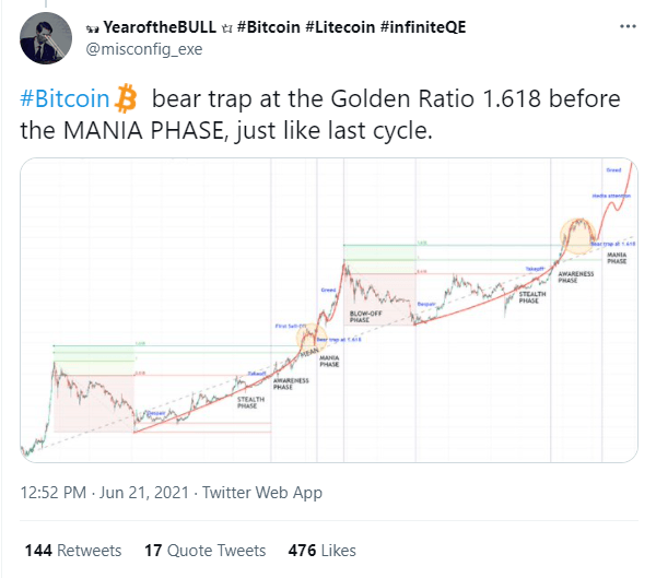 The third scenario some analysts are focusing on suggests that the current price movements have set up a bear trap that echoes a move seen during the last cycle which involves a pullback to the 1.618 golden ratio extension level which will then be followed by a breakout to new highs.