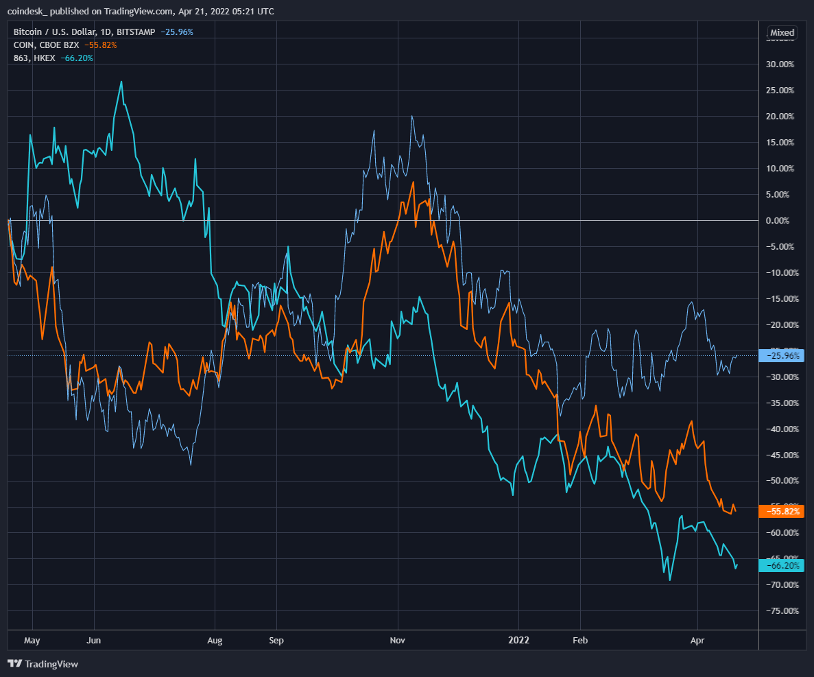 But just over a year since its IPO, Coinbase’s stock is down nearly 55%, underperforming bitcoin, which is down around 26% for the same time period (to be sure, many tech stocks are also down for this same period), as investors’ appetite for listed crypto companies seems to have waned.
