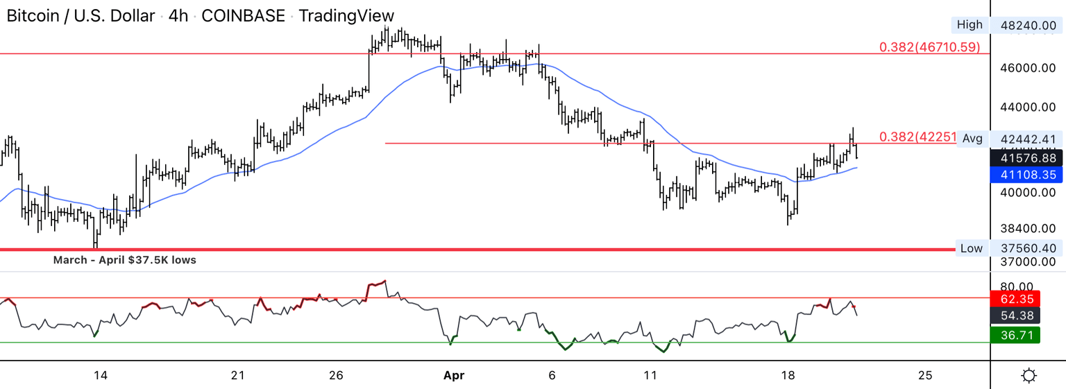 The relative strength index (RSI) on the four-hour chart is declining from overbought levels, which typically occurs during a brief pullback in price. Still, support at $40,000 could maintain BTC's recovery phase.