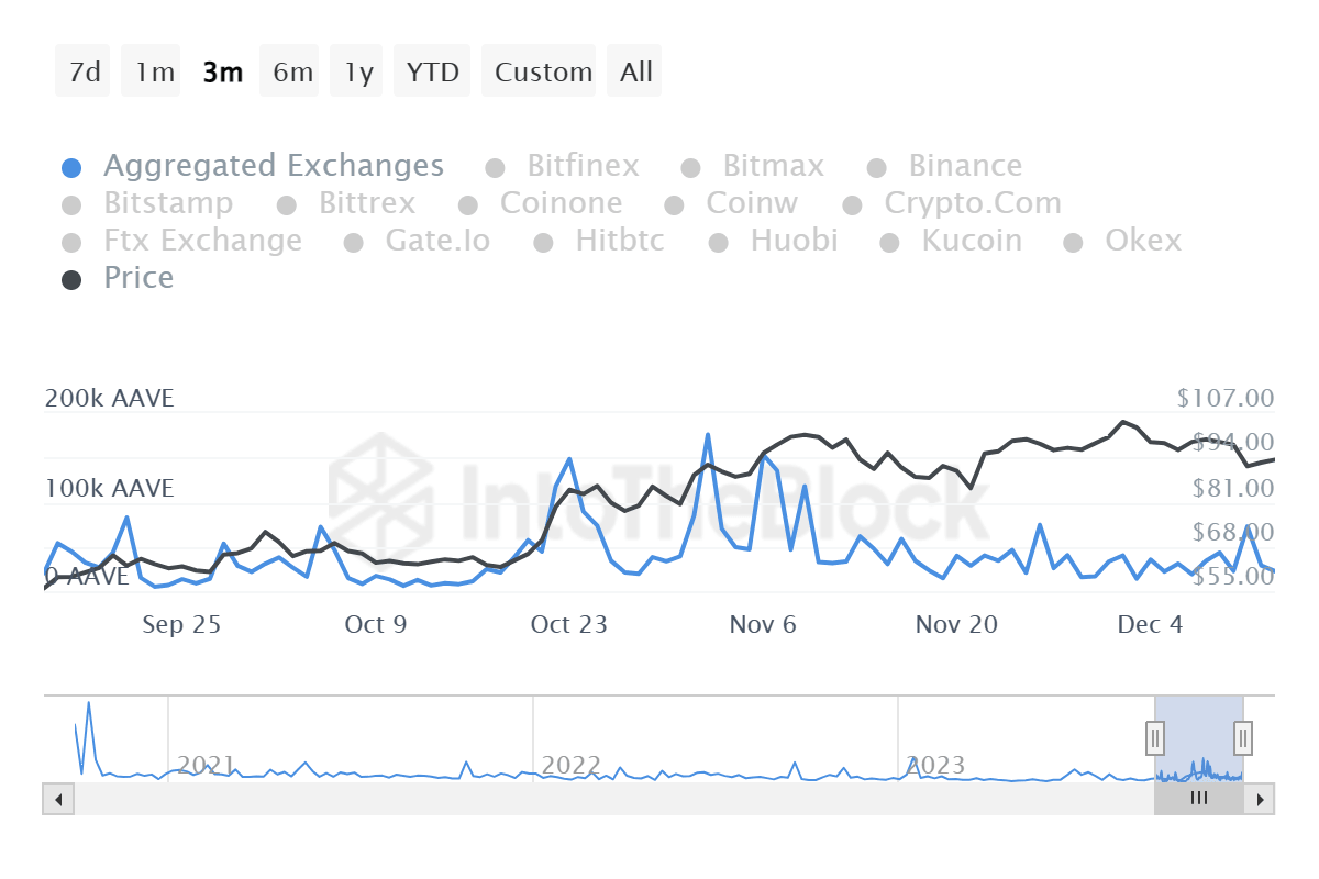 Elsewhere, on-chain aggregator IntoTheBlock’s inflow volume metric shows that the volume of AAVE tokens flowing into centralized exchanges has been reducing for the past three days, moving from 72,490 AAVE tokens on December 11 to 22,420 AAVE tokens on December 13. This constitutes a 69% drop in 48 hours and shows that interest in selling AAVE tokens continues to reduce.