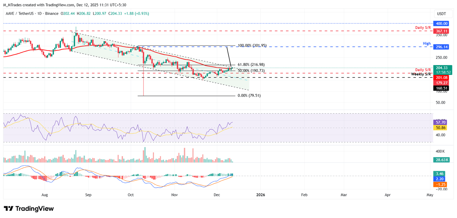 Aave (AAVE) price is trading above $204 at the time of writing on Friday and approaching the upper boundary of its descending parallel channel; a breakout from this structure would favor the bulls. Moreover, on-chain and derivatives data also support bullish sentiment, while the pattern’s technical target suggests a rally above $296.
