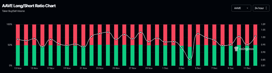On the derivatives side, Aave’s funding rate data also support signs of a rally. According to Coinglass’s OI-Weighted Funding Rate data, the number of traders betting that the price of Aave will slide further is lower than those anticipating a price increase.