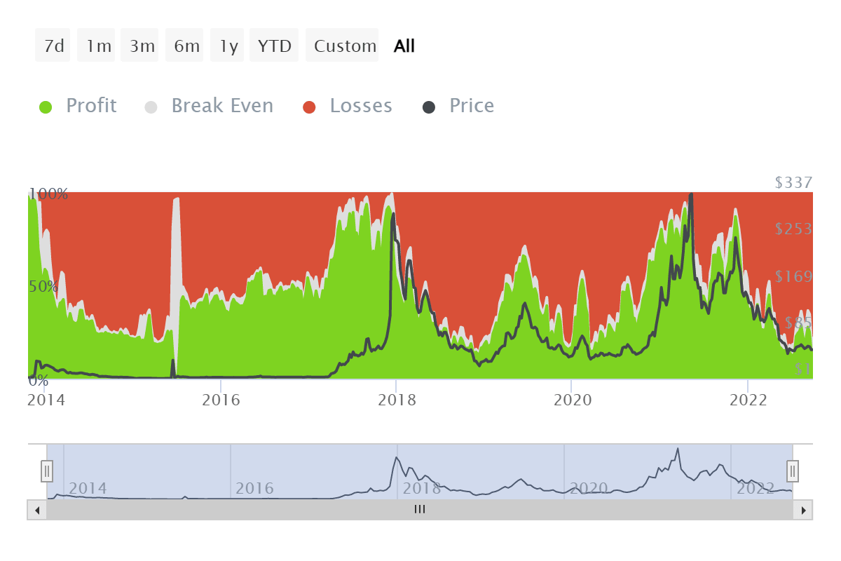 - The lack of recovery has led to over 78% of all Litecoin investors witnessing losses on their holdings.