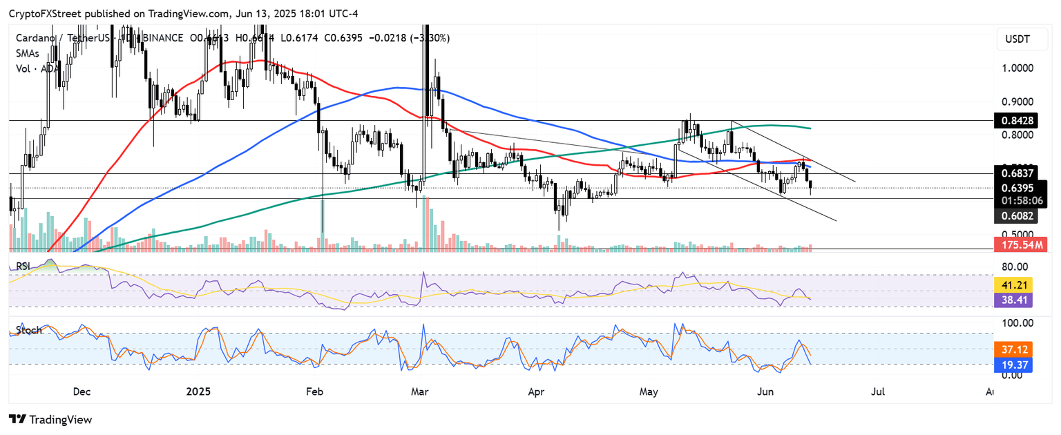 ADA is down 4% following rising war tensions in the Middle East between Israel and Iran. The altcoin saw a rejection near the upper boundary of a key descending channel — strengthened by the confluence of the 100-day and 50-day Simple Moving Average (SMA).