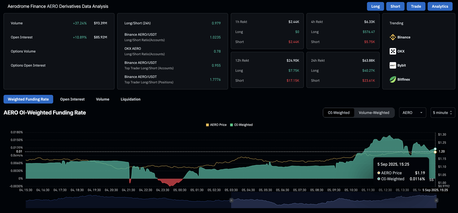 CoinGlass data shows that the AERO Open Interest (OI) has increased over 10% in the last 24 hours, reaching $85.92 million. This sudden increase in capital inflow, fueling the active positions of AERO futures and option active contracts, displays a risk-on shift among derivatives traders.