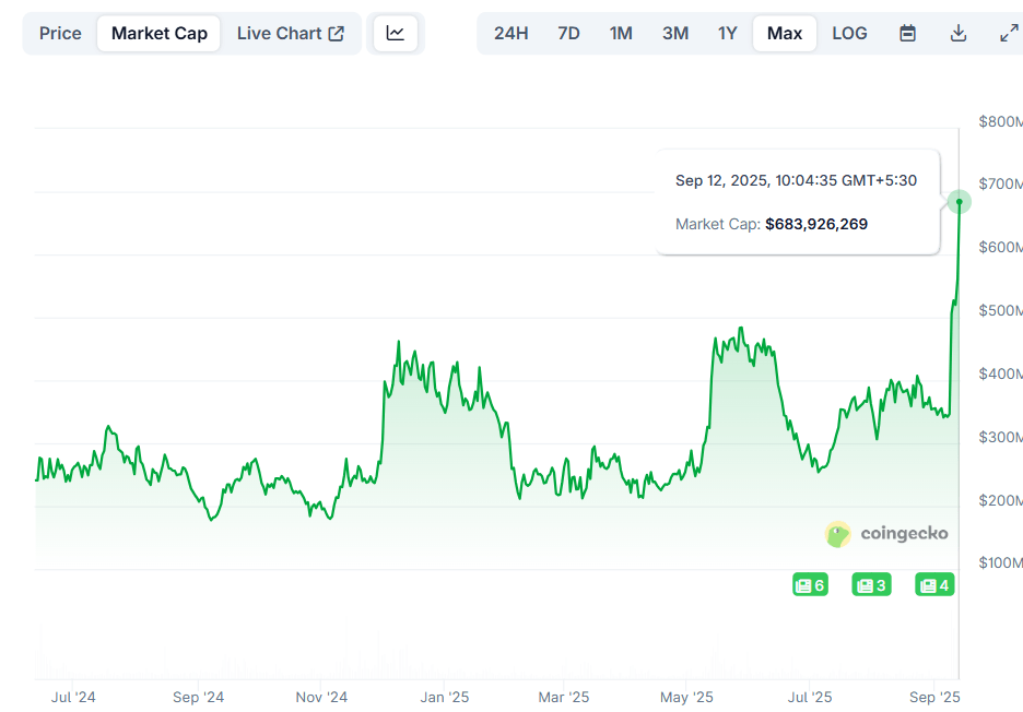 Aethir price has surged more than 90% so far this week, reaching a four-month high, with its market capitalization climbing past $683.92 million on Friday, according to CoinGecko data, shown below.
