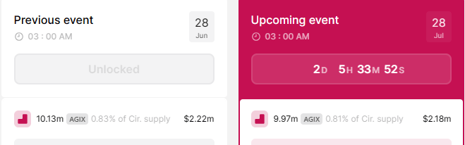 According to data from TokenUnlocks.com, up to 9.97 million AGIX tokens will be released into the market, worth approximately $2.18 million. The event is due in just over two days on July 28, with the tokens set for release constituting up to 0.83% of SingularityNET's total supply.