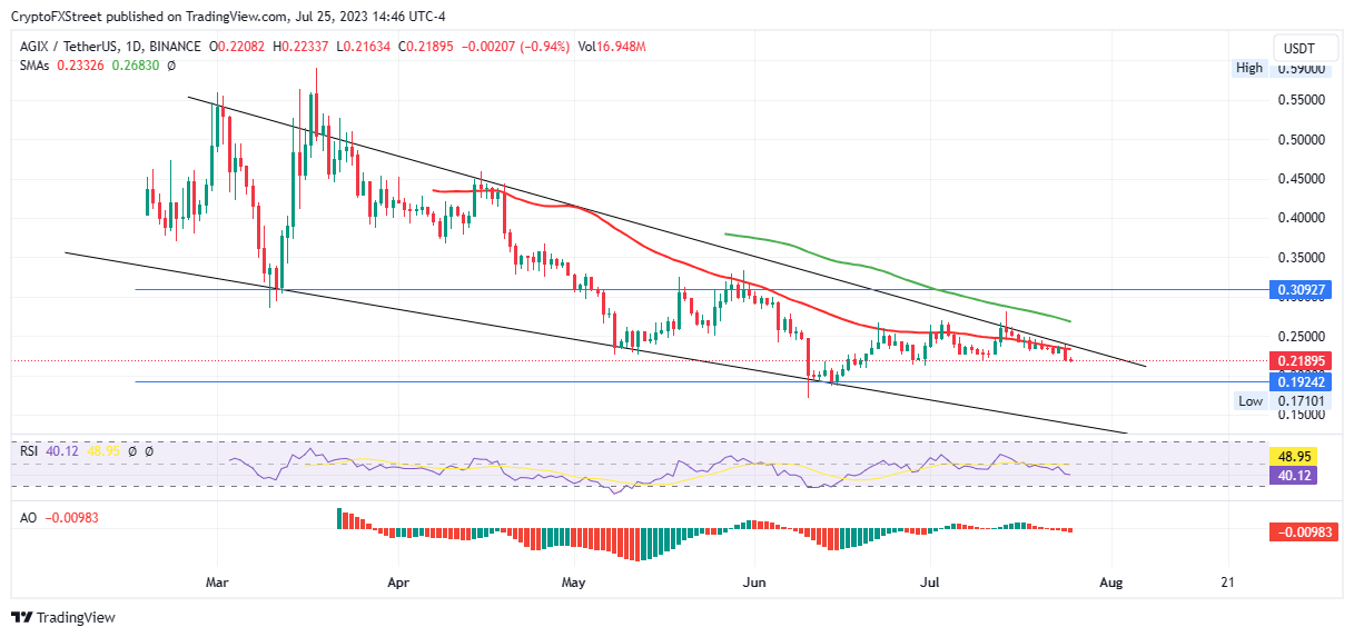 At the time of writing, AGIX is auctioning at $0.219 while still sliding south within a descending channel. Momentum indicators such as the Relative Strength Index (RSI) and the Awesome Oscillators (AO) are both headed south. This shows that momentum is falling and suggests a continued downtrend.