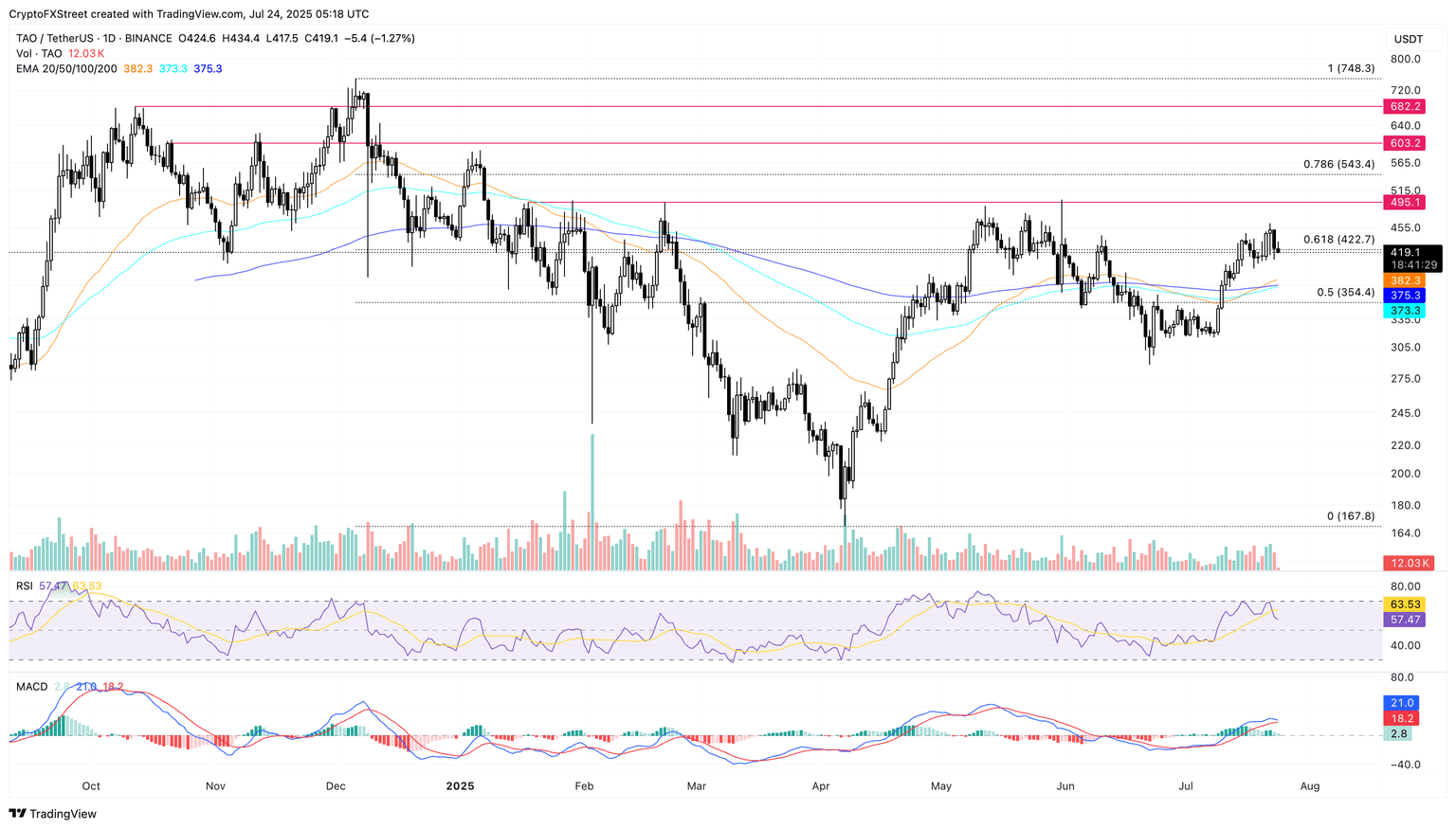 TAO tests the 61.8% Fibonacci level at $422, drawn from $748 on December 5 to $167 on April 7. A potential close below this level could extend the decline to the 50-day EMA at $382.