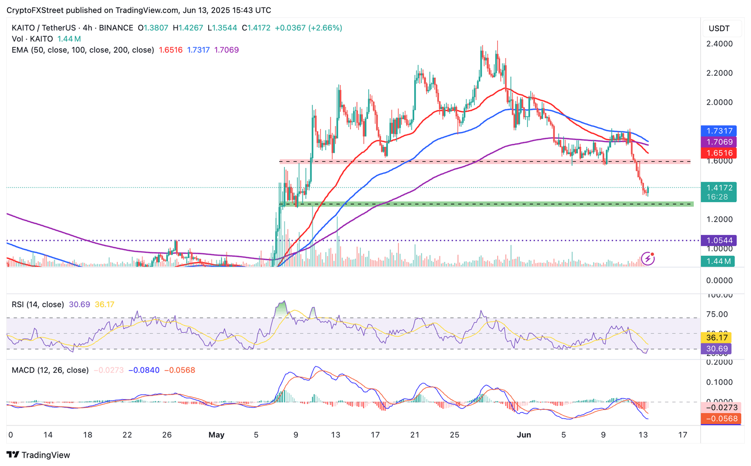 - Kaito approaches a critical support area alongside overload RSI ahead of a potential rebound.