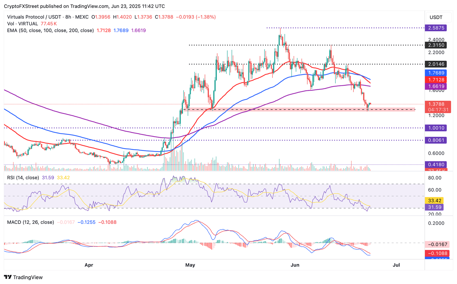 Virtuals Protocol’s price holds above support at $1.25, trading at around $1.37 at the time of writing. Interest in the AI token is on track following the Israel-Iran conflict-triggered crash.