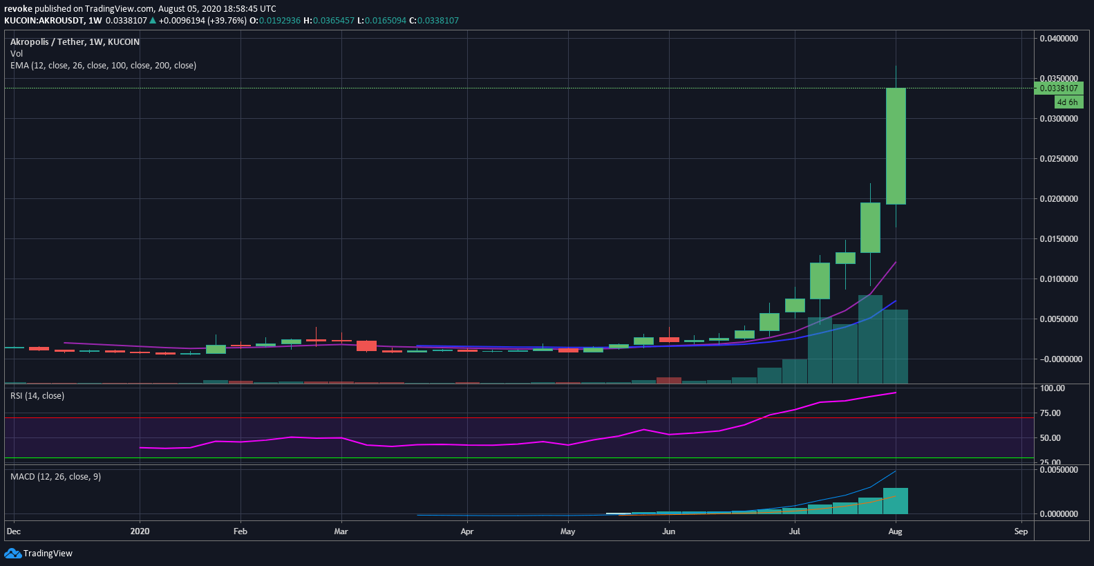 Akropolis has been riding the daily 12-EMA for basically a month. AKRO is trading inside a healthy and sturdy daily uptrend and has exploded in the last 24 hours cracking $0.03 after a massive 60% price surge.