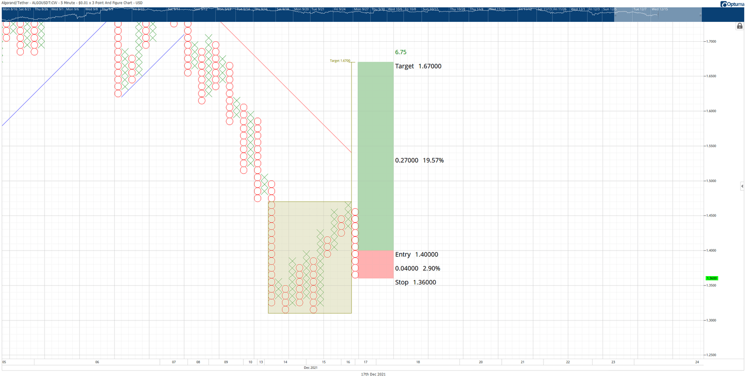 Adding to that strength is the current pattern developing known as a Spike Pattern. This pattern occurs when there are fifteen or more Xs or Os in a single column – conditions that Algorand would fulfill if it moves lower to $1.30. The entry on the Spike Pattern is the three-box reversal. Currently, the hypothetical trade setup is a buy stop order at $1.40, a stop loss at $1.36, and a profit target at $1.67. A trailing stop of 3-boxes would help protect any implied profit post entry. However, if Algorand moves lower, the entry trails lower as well. The stop loss remains a four-box stop and the profit target doesn't change.