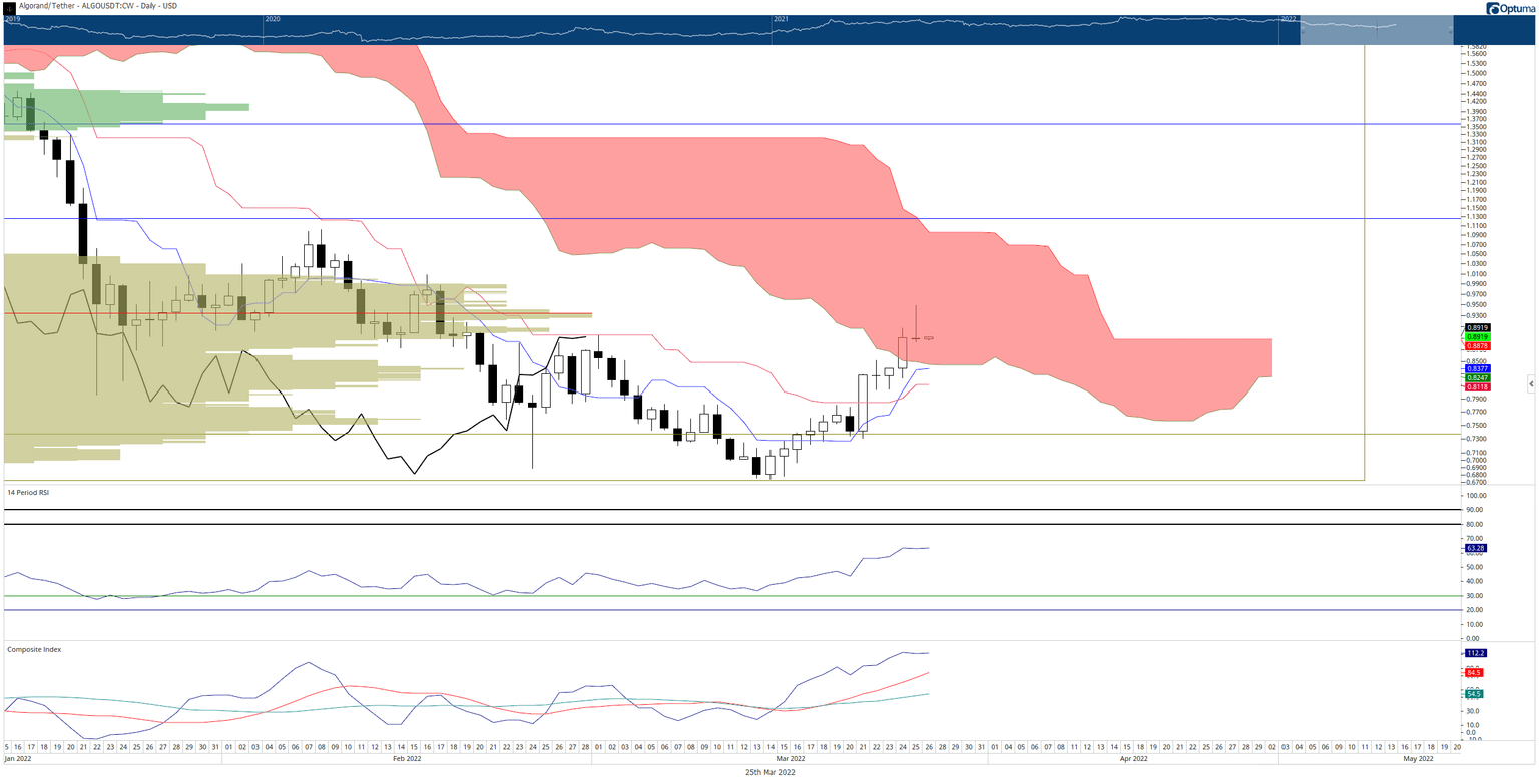 While the profit target is identified at $1.18 on the Point and Figure chart, originally, the analysis warned that Algorand price was likely to find resistance and selling pressure before the profit target would be hit due to the 2022 Volume Point Of Control, the weekly Tenkan-Sen, and the 61.8% Fibonacci retracement in the $1.05 to $1.10 price range.
