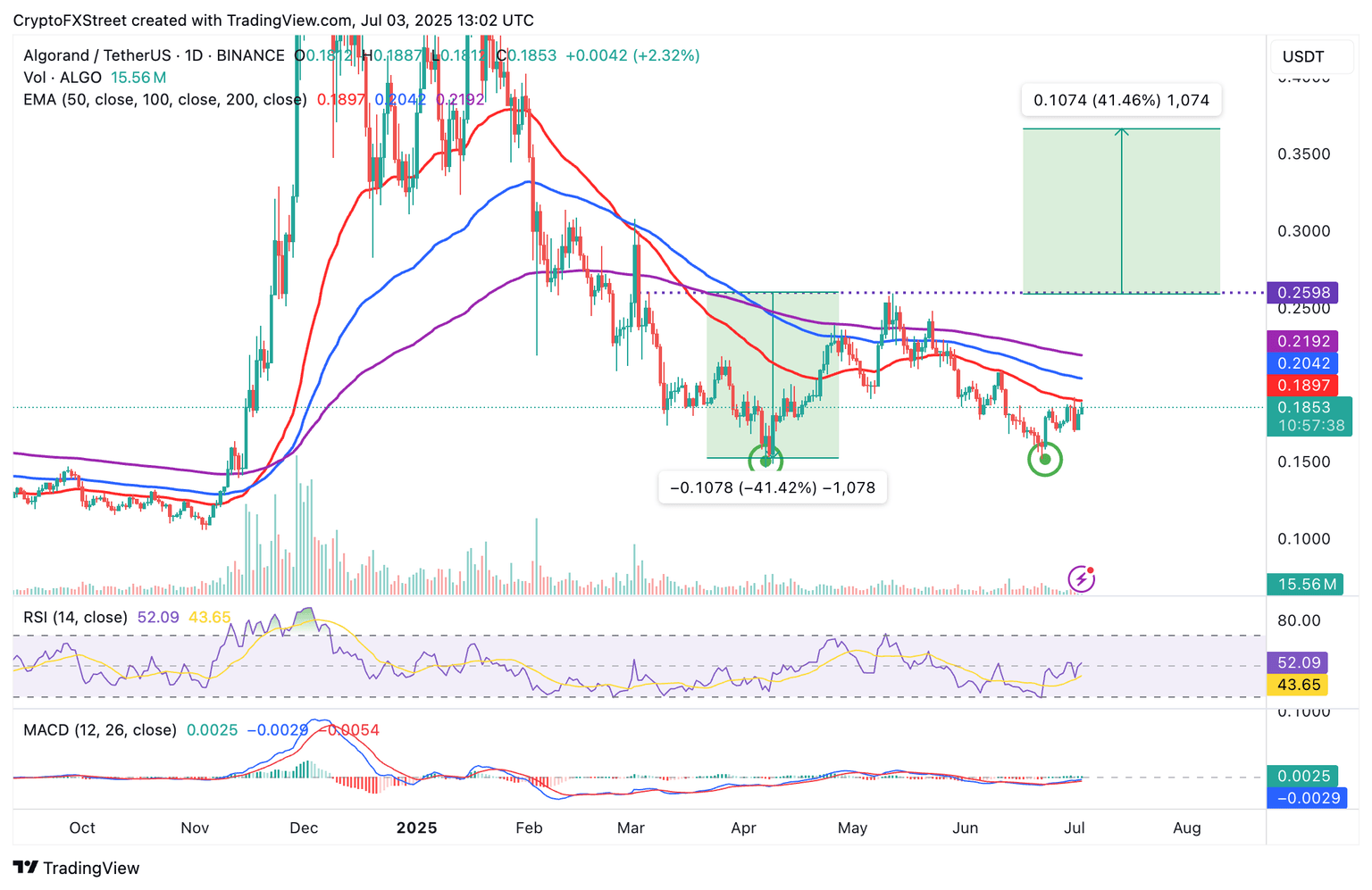 Algorand (ALGO) is trading at $0.1853, following a nearly 20% recovery from its recent lows of $0.1521 reached on June 22. A buy signal from the Moving Average Convergence Divergence (MACD) indicator indicates that ALGO could breach the immediate resistance at $0.1897. This hurdle falls near the 50-day Exponential Moving Average (EMA).