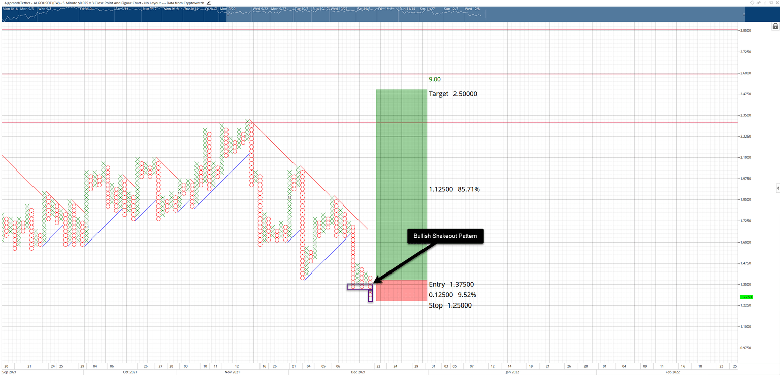 Algorand price is developing one of the rarest and most sought-after bullish reversal patterns in Point and Figure Analysis: the Bullish Shakeout. The Bullish Shakeout pattern is only valid during an uptrend and shows up near or at the bottom of a corrective move. The pattern requirements are two to three Os below a triple-bottom (minimum of two Os, maximum of three Os) at the bottom of a swing.