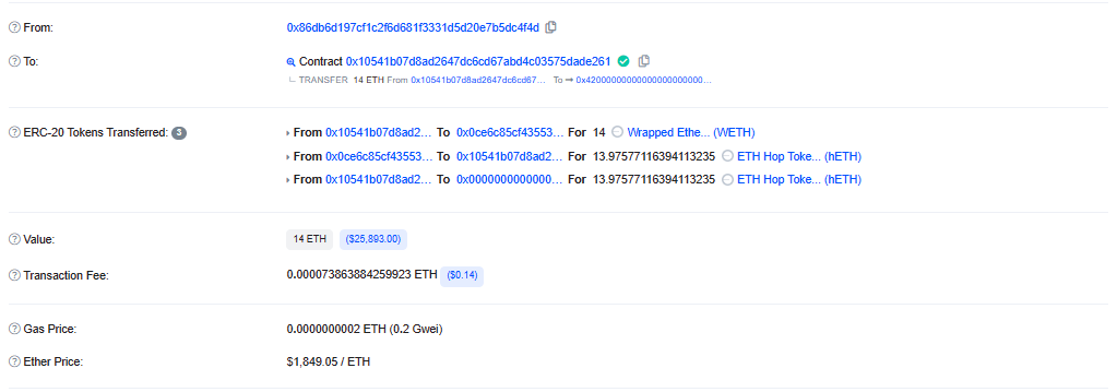 After launching the FrensTech on Base, AzFlin used Hop cross-chain protocol to transfer his loot (14 ETH) from the Base network.