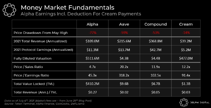 A recent report from Delphi Digital highlighted the protocol's fee structure and calculated that the V2 annualized protocol earnings are projected to be $6.53 million, meaning that “Alpha trades at a relatively cheap P/E ratio compared to its peer group.”