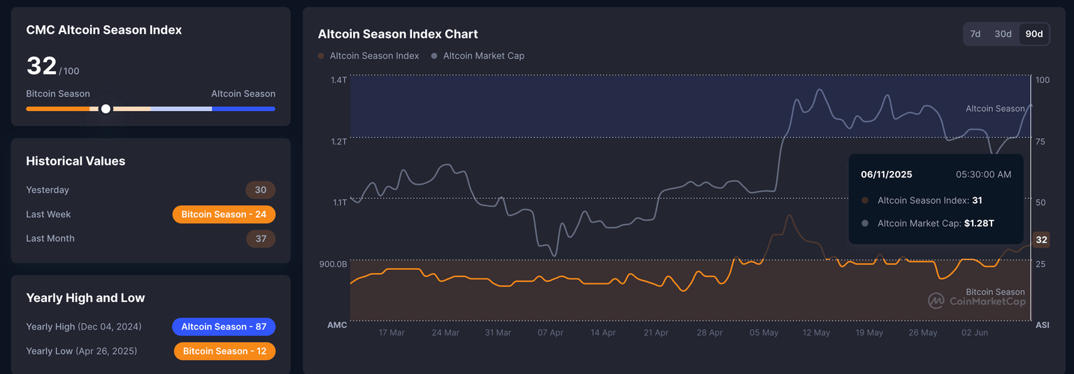 Additionally, the CoinMarketCap Altcoin Season Index stands at 32, a notable increase from 17 on May 30, suggesting a higher likelihood of an altseason as the Bitcoin season declines. The index tracks the top 100 altcoins' performance relative to Bitcoin over the past 90 days.
