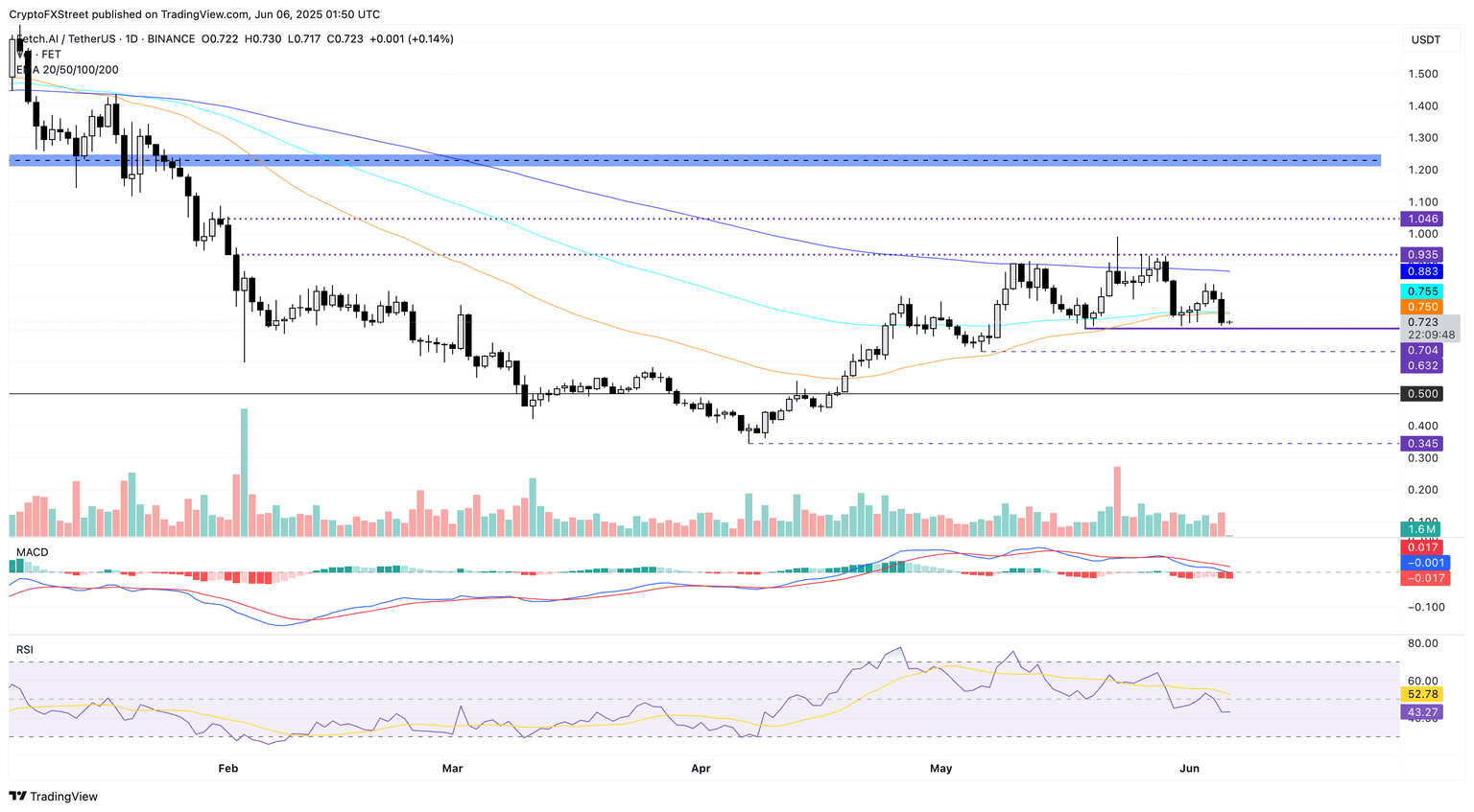FET evaporates the early week gains with two consecutive bearish days and is down nearly 5% so far this week. The AI token breaks under the 50-day and 100-day EMA merger near $0.75 and approaches the $0.70 support level highlighted by the low on May 19.