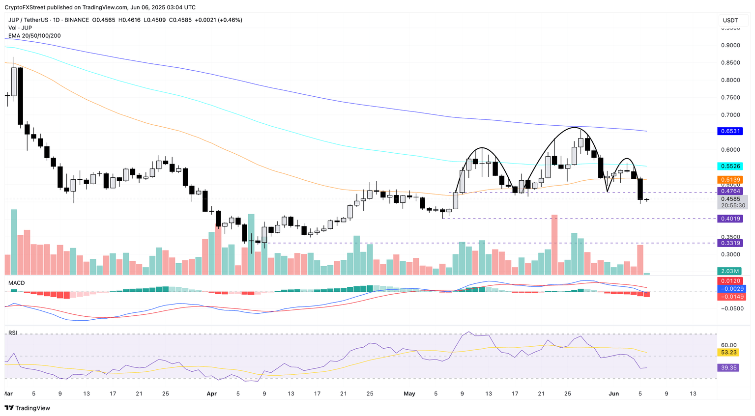 However, a reversal in JUP closing above the broken neckline at $0.4764 could propel it to the 50-day EMA at $0.5139.