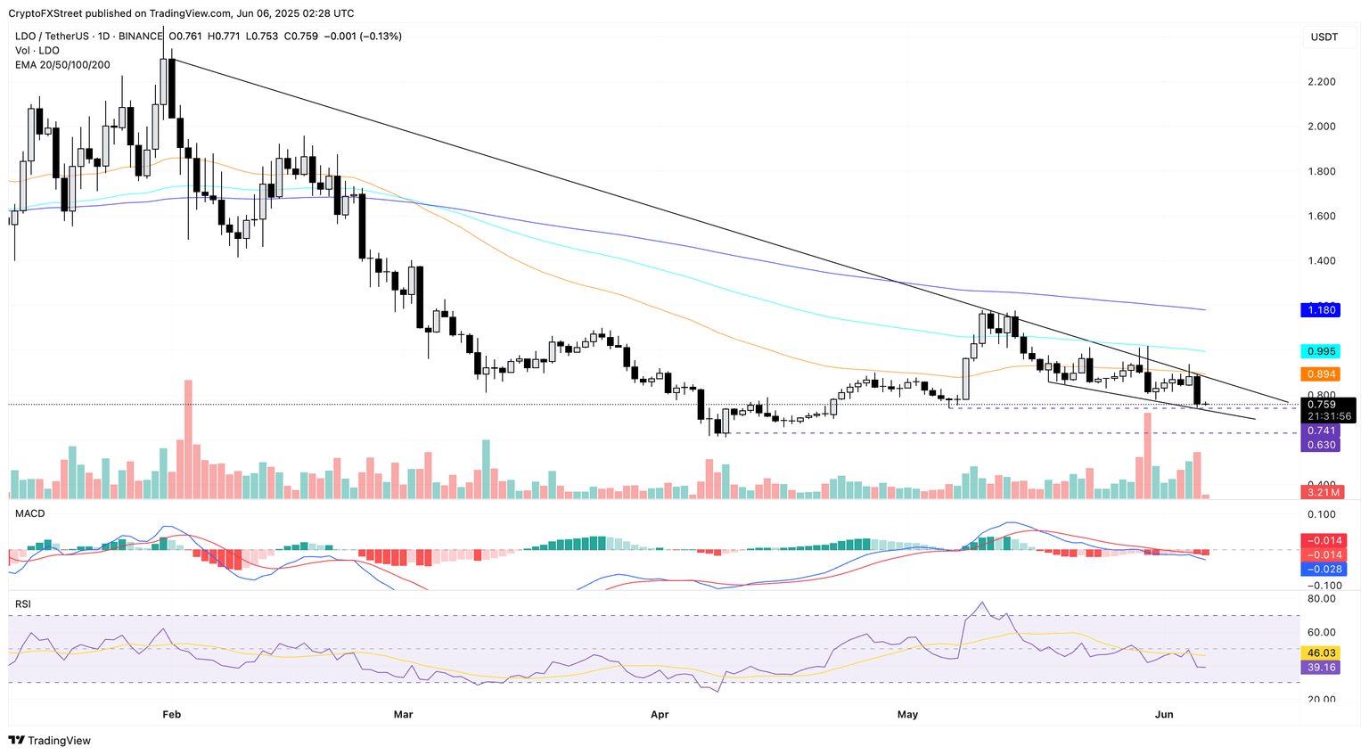 Currently, the altcoin finds support from a declining trendline formed by the daily lows of May 18, 20, and 31. Completing a falling wedge with the support trendline, swing highs in LDO on January 31, May 13, and June 4 give rise to a converging resistance trendline.