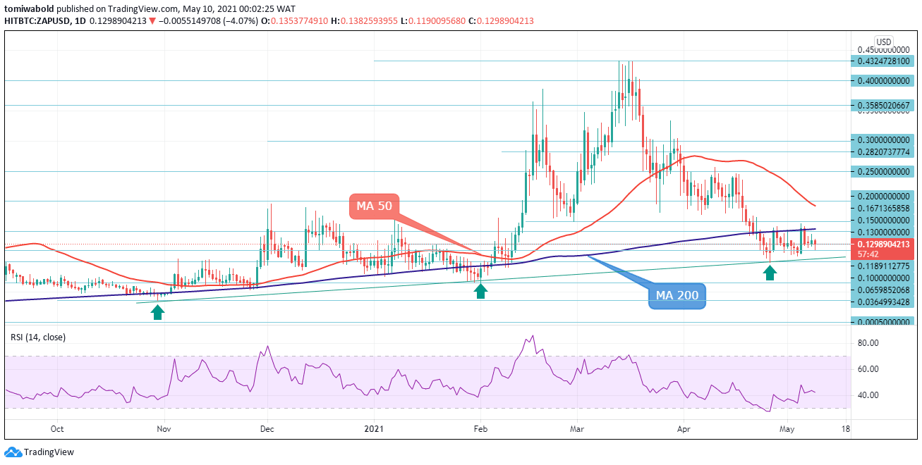 The ZAP market is buzzing and is poised for a strong upside correction amid a recent slide to a $0.10 low. After an impressive run on May 5 from $0.1134 to $0.1629 showed that the ZAP/USD recovery is gaining momentum by breaching the moving average (MA 200), market forces have realigned for the upcoming surge. Its price showed some broad strength on Saturday to $0.1457, and ZAP/USD fell briefly to the $0.1189 support level.