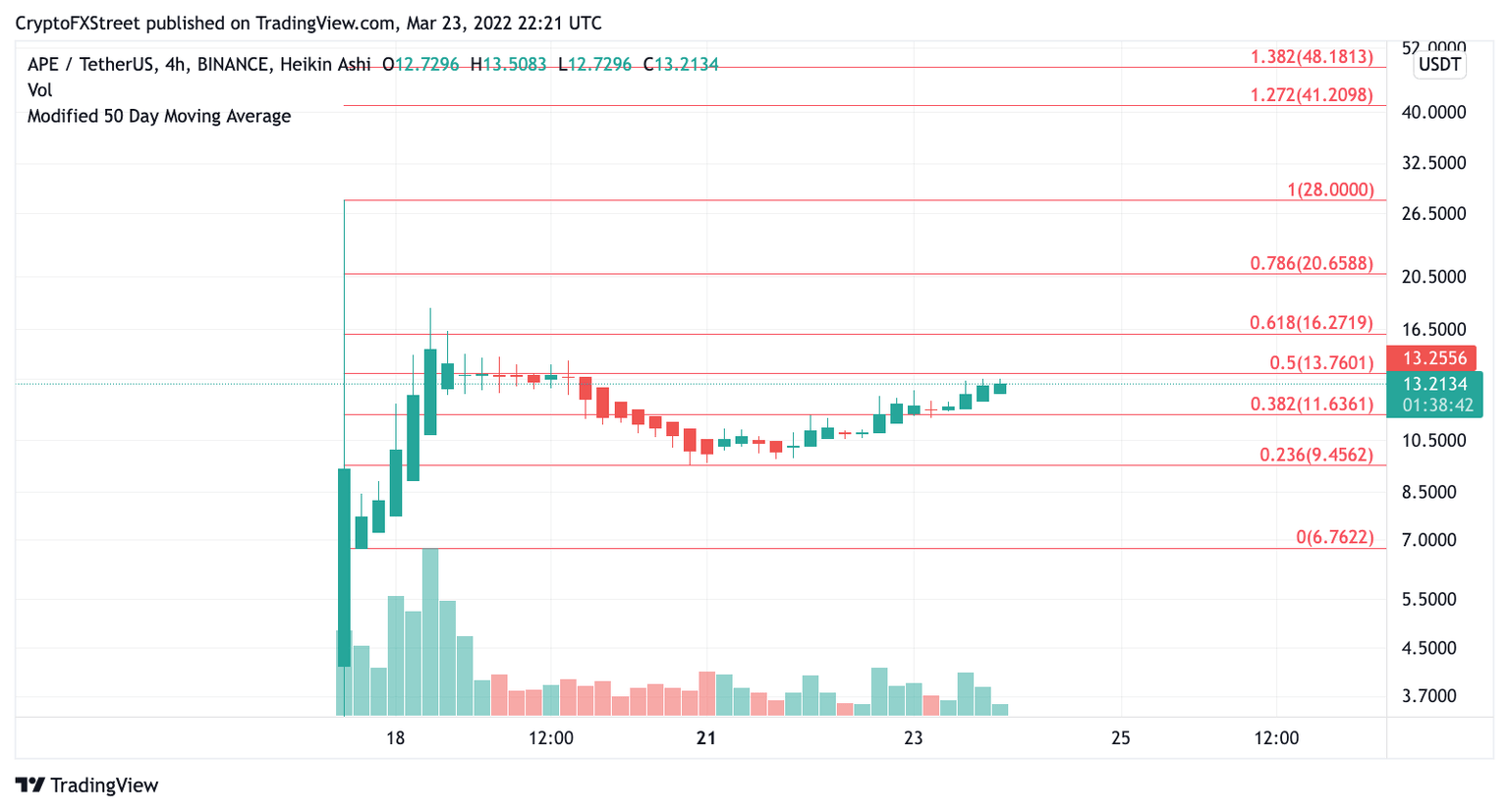 Now ApeCoin price faces strong resistance at the .5 Fibonacci level. If bulls can maintain strength by closing above $13.76, then the next target for the APE price will be $16.50, representing a 20% increase from the current levels.