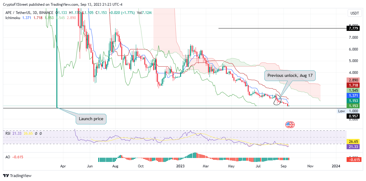 In the last sequence of cliff token unlocks on the APE network, August 17, ApeCoin price fell 15% on the D-day. Cumulatively, it dipped around 35% between August 15 and 17. If history repeats itself, the altcoin could fall below its debut price of around $0.957.