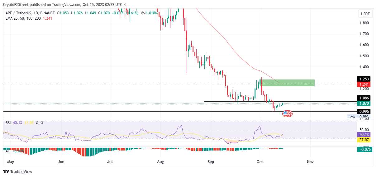 With this outlook, chances that the recovery rally is premature remain high and ApeCoin price could face a rejection from the $1.086 resistance level. The ensuing selling pressure could send APE back to the support floor at $0.996, potentially breaking below this to tag the $0.993 range low.
