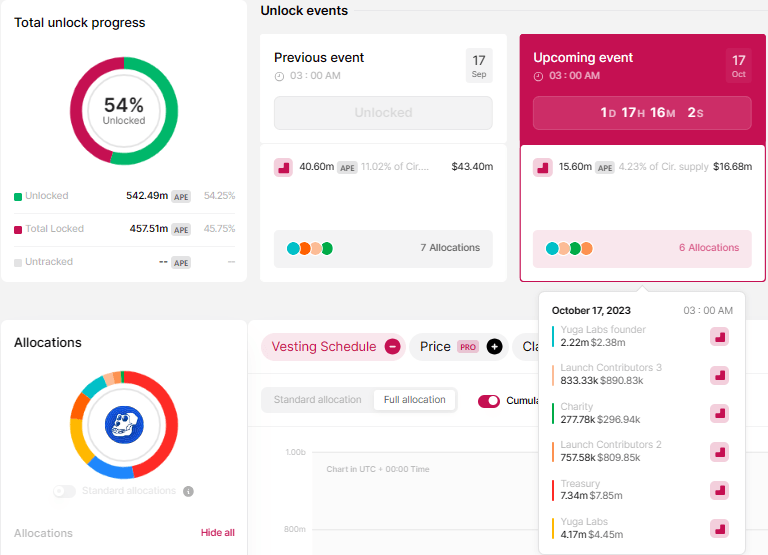 - 15.6 million APE tokens worth $16.68M will be unlocked on October 17, with some going to launch contributors or investors.