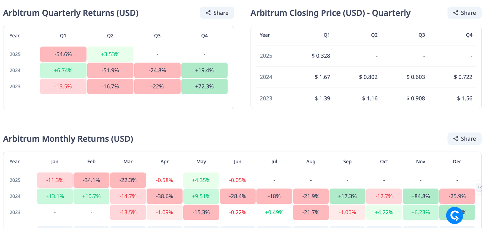 Arbitrum quarterly and monthly returns | Source: CryptoRank