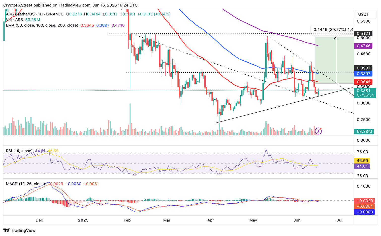 Similarly, as the price of ARB consolidates, a falling wedge continues to form. A breakout above the broken upper trendline could boost the price by 39% to $0.50, accompanied by an increase in trading volume.
