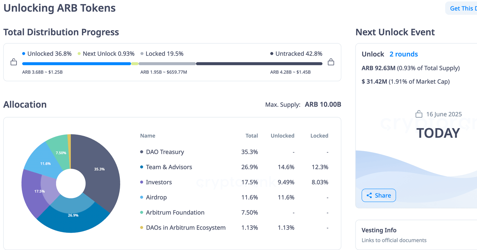 According to CryptoRank, the token unlock event is expected to increase the circulating supply by approximately 93 million ARB, valued at around $32 million, representing 1.90% of the asset’s market capitalization.
