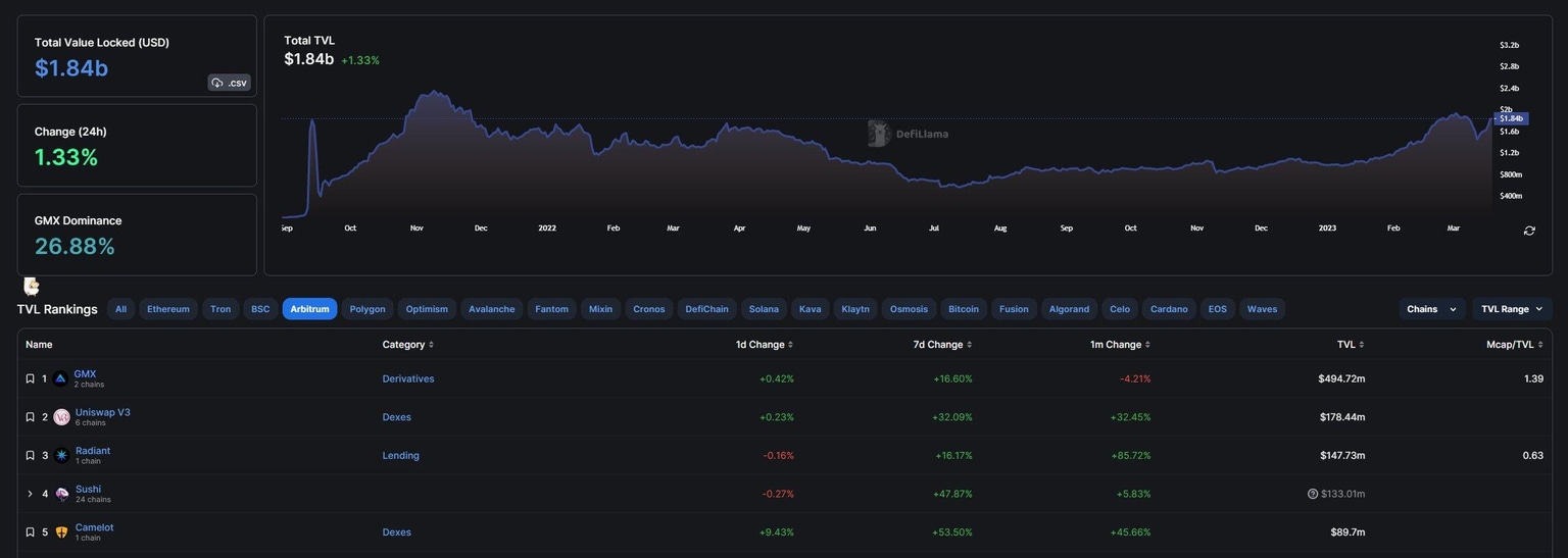 There are already rumors of the ARB airdrop going down as the most lucrative airdrop in crypto history. Based on DefiLama data, Arbitrum total value locked (TVL) currently sits at 1.84 billion, with GMX, UniV3, Radiant, Sushi, and Camelot making up the top 5 Dapps by TVL, respectively. Using TVL to approximate earnings, Arbitrum will presumably earn $1.84 billion annually.